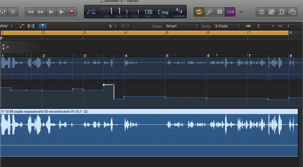 Quanto può apparire incongruente, e aggiungerei straniante, dare avvio a un progetto sull'oralità usando un’immagine? Molto, sarebbe la risposta implicata dalle attese di chi, giustamente, riterrebbe sia giunto il momento di dare il giusto peso e valore alla dimensione orale della poesia. Si tratta, nello specifico, di una raffigurazione visiva dell’incipit del secondo canto della Ragazza Carla (1960), ottenuta attraverso l'uso di un programma - nel caso in questione Logic Pro - che consenta il monitoraggio digitale del suono. La traccia sonora è stata estratta da un video attualmente reperibile sulla pagina YouTube di Videor Rome, registrato il 17 dicembre del 1989 presso la redazione sita in via Margutta 51[1]. Questo grafico trasforma dei suoni in un'immagine che cristallizza l’inafferrabilità di sillabe pronunciate e perdute appena dopo l’atto dell’afflato. Dalla forma d'onda tracciata si riconosce la variazione dell'intensità della voce, di cui il software scansiona anche i “bpm”.