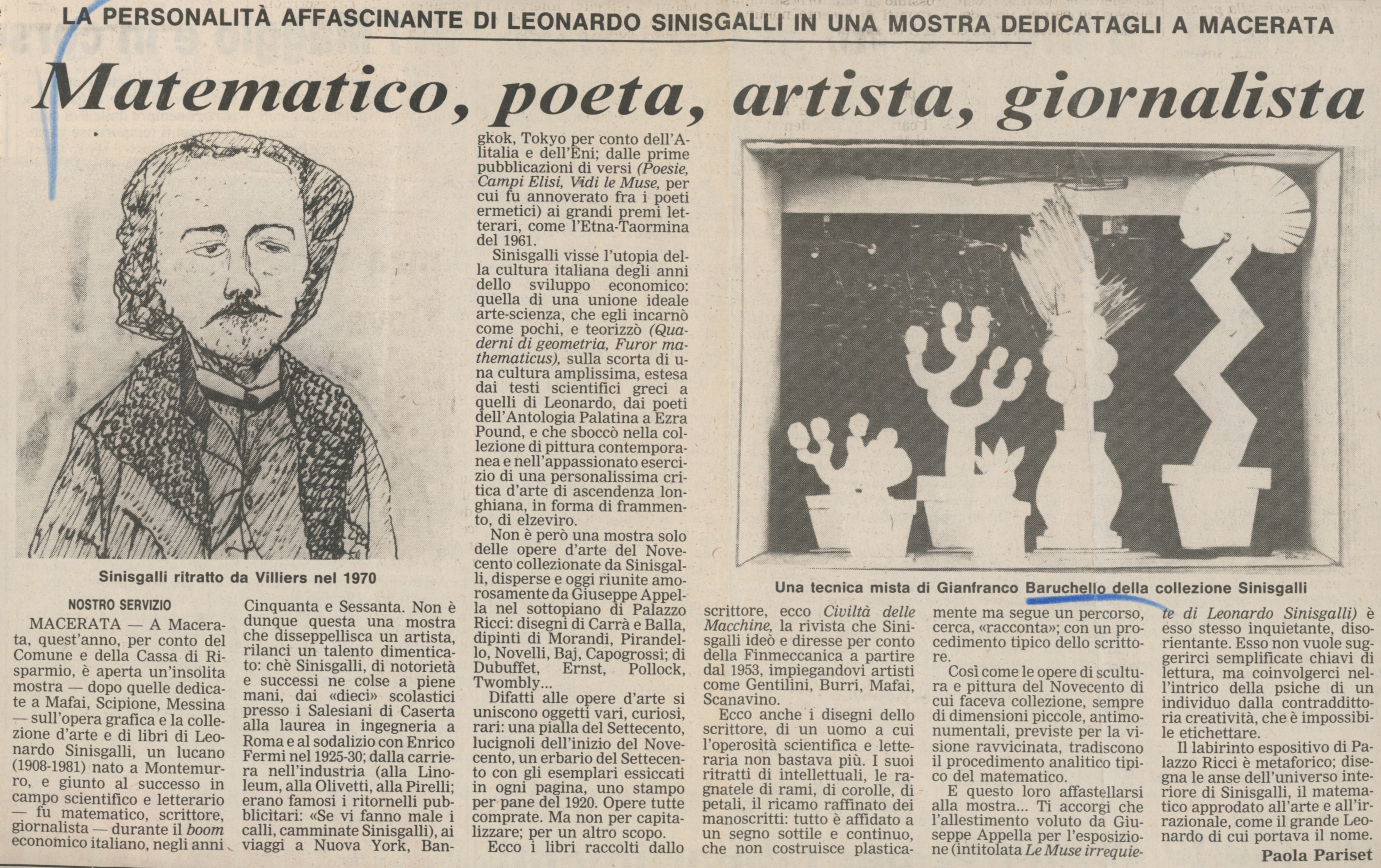 Tra questi, un articolo firmato da Paola Pariset e pubblicato sul «Giornale di Brescia» recensisce la mostra Le Muse irrequiete di Leonardo Sinisgalli tenuta nel 1988 a Palazzo Ricci a Macerata[6]. La mostra nasceva dal desiderio di profilare una biografia esaustiva e sfaccettata del poeta e matematico, portando all’attenzione del pubblico l’attività condotta in ambito scientifico, letterario e artistico, come critico d’arte, come direttore della rivista «Civiltà delle macchine» e come collezionista di opere. Ai libri di poesia, premi letterari ricevuti e scritti scientifici erano accostate le opere degli artisti collezionate nel corso del tempo, prediligendo «scultura e pittura del Novecento […] sempre di piccole dimensioni, antimonumentali, previste per la visione ravvicinata»[7].