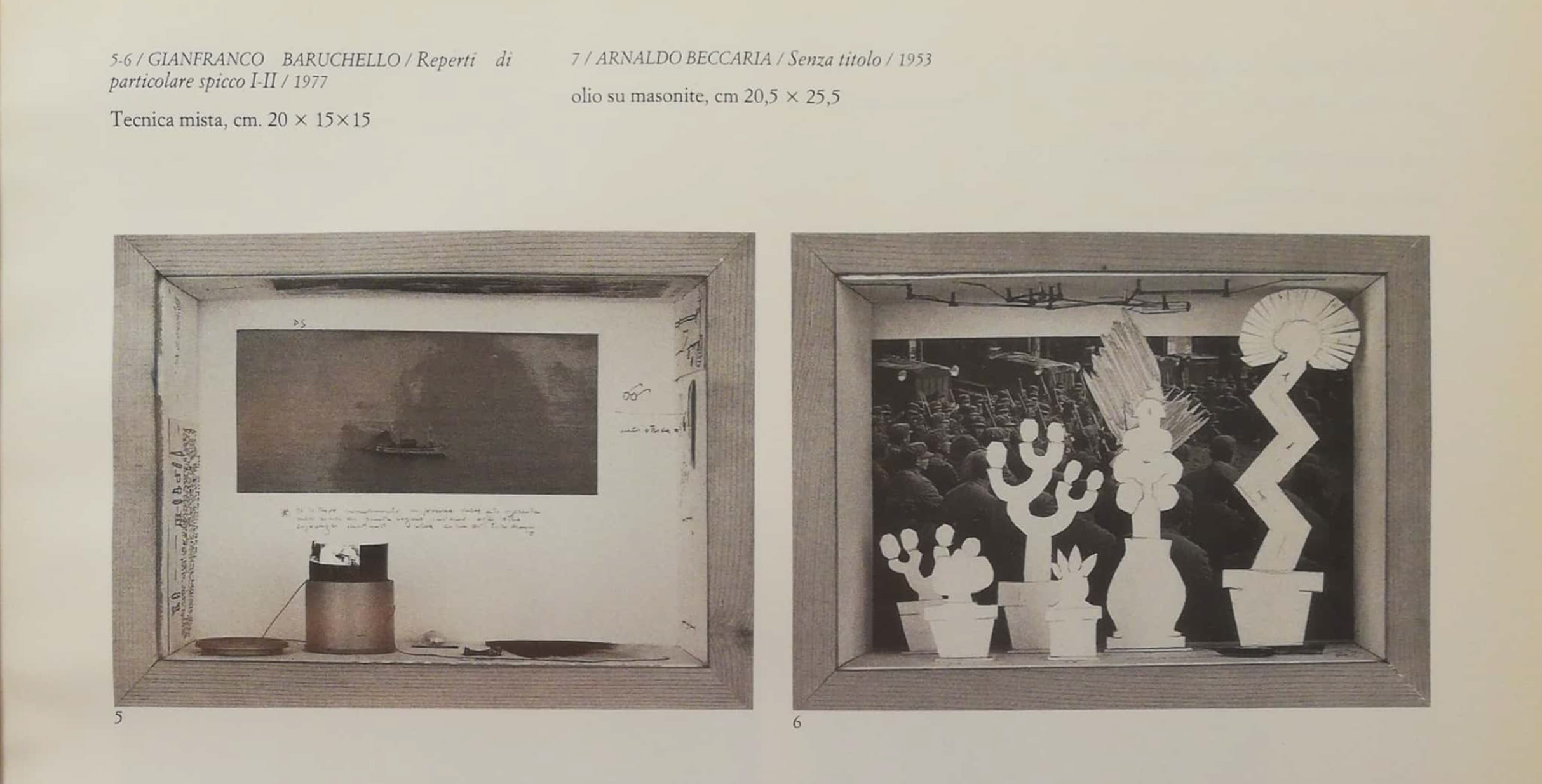 Fig. 2 Gianfranco Baruchello, Reperti di particolare spicco I e Reperti di particolare spicco II, 1977 (media diversi, legno, vetro, 20 x 15 x 15 cm) riproduzioni delle opere in Le muse irrequiete di Leonardo Sinisgalli. |