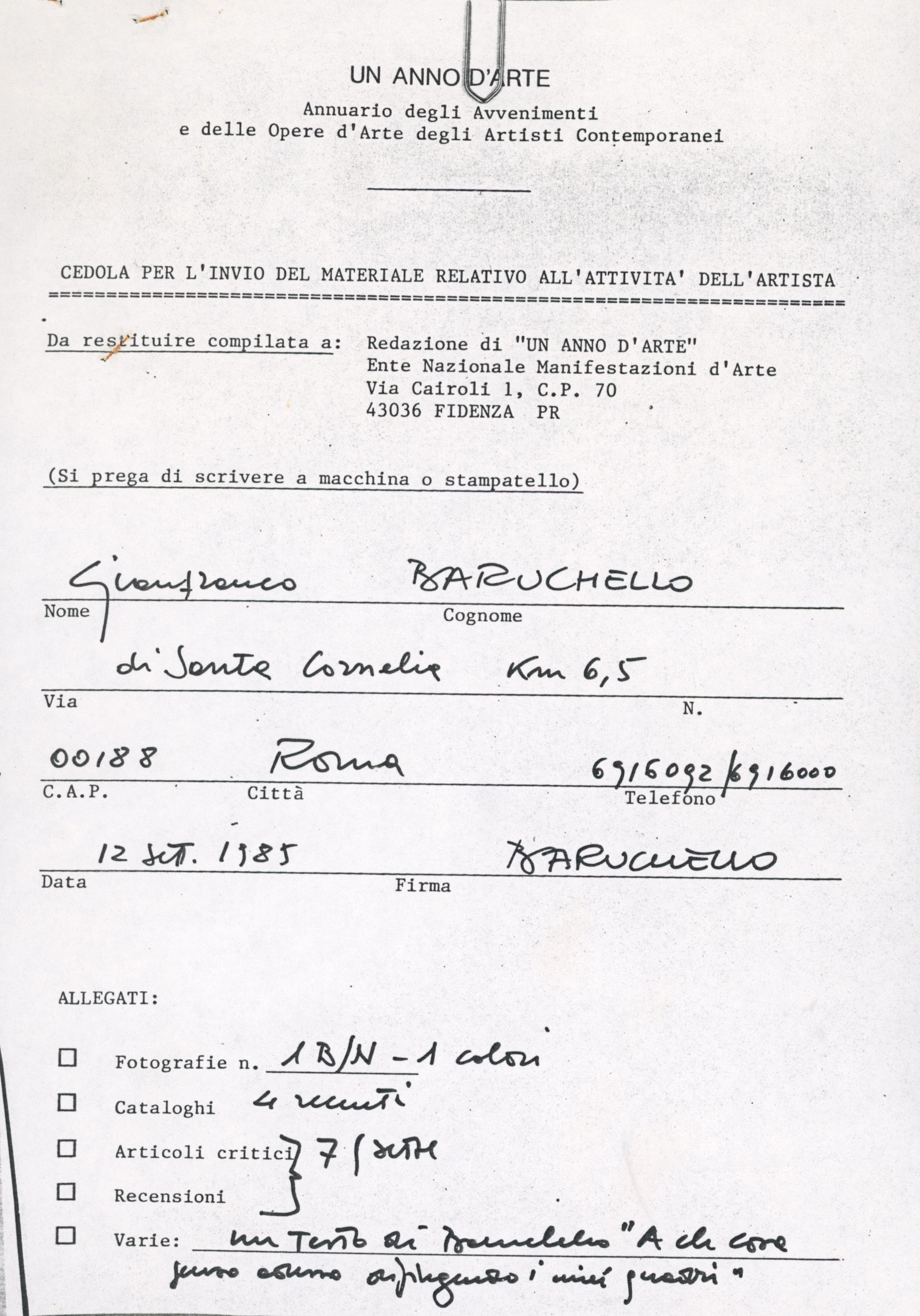 Qui si trova, tra gli altri, la fotocopia del documento inviato da Baruchello al comitato redazionale dell’Ente Nazionale delle Manifestazioni d’Arte preposto alla raccolta dei materiali, poi confluiti nel volume Un anno d’arte pubblicato nel 1986 dalle edizioni Fabri[16]. Il volume, come riporta il sottotitolo, è «un annuario degli avvenimenti e delle opere d’arte degli artisti contemporanei»[17] volto a documentare la ricerca degli artisti a livello internazionale, fino all’anno precedente la pubblicazione, organizzato in sezioni costituite dalla raccolta di fotografie e testi pubblicati inviati, su richiesta della redazione, dagli stessi artisti rappresentati.