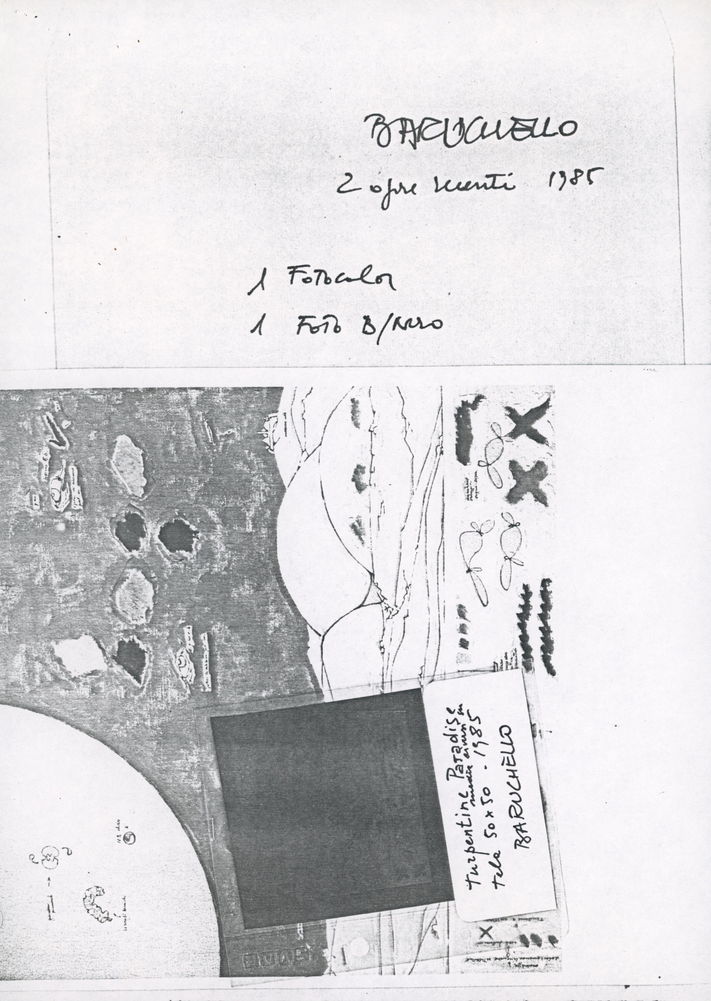 Parte di questo materiale inviato è documentato da una fotocopia allegata nella stessa cartella in cui, su uno stesso foglio, appaiono sovraimpresse le due riproduzioni fotografiche menzionate, corredate da una sintetica descrizione apposta dall’artista: «2 opere recenti 1985 1 fotocolor e 1 foto in bianco e nero»[20].
