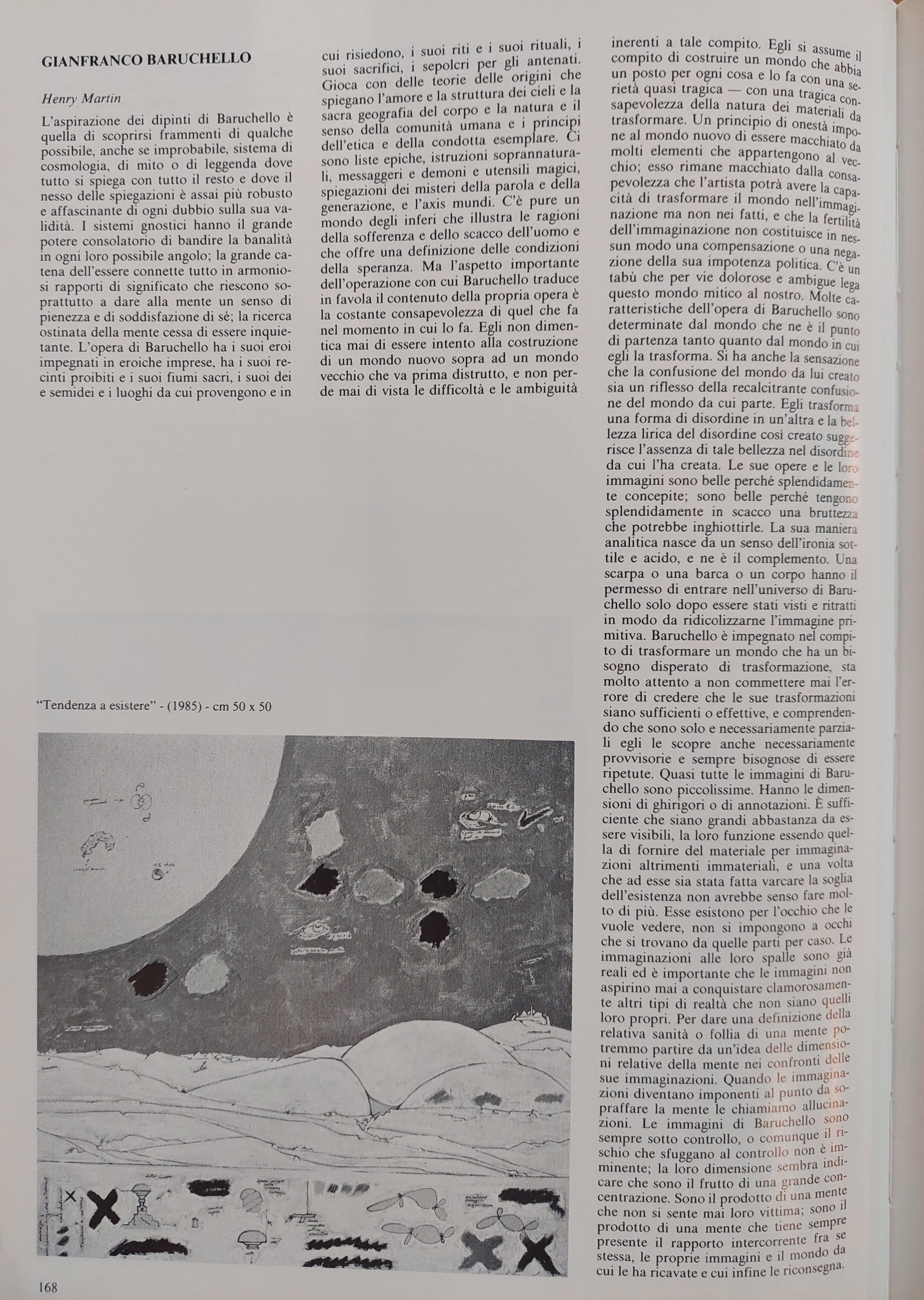 In secondo luogo, possiamo considerare Tendenza a esistere un’opera realizzata in stretta connessione alle altre citate. Nella loro unitarietà compositiva, iconografica e materiale, esse corrispondono al ciclo pittorico dedicato alle «Descrizioni di Paradiso», citato dallo stesso Baruchello nella sua agenda personale del 1985, in cui alla data del 5 febbraio si legge: «Nel pom[eriggio] finisco quasi il 1° 50x50 sulle “Descrizioni di Paradiso”»[23].