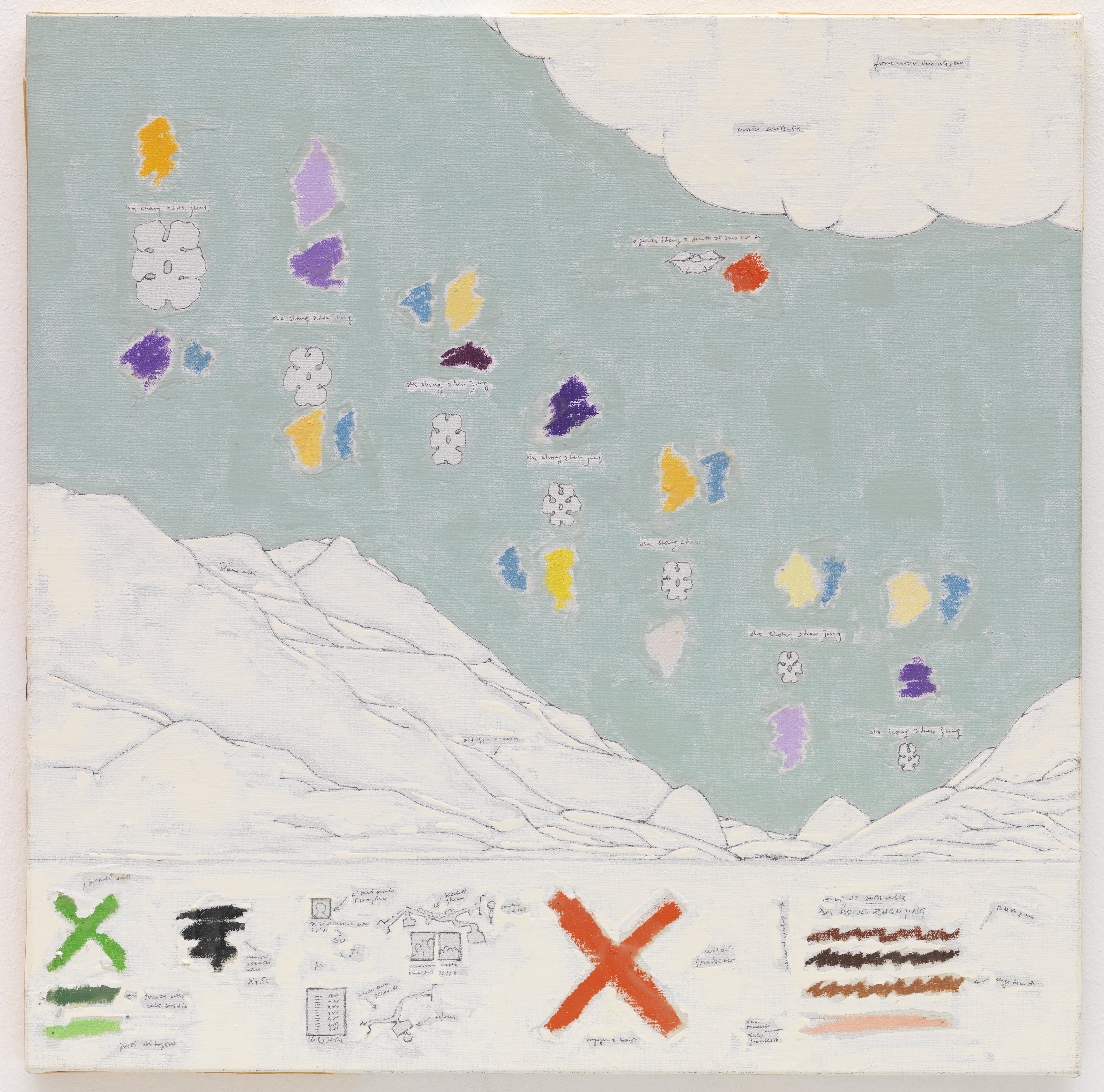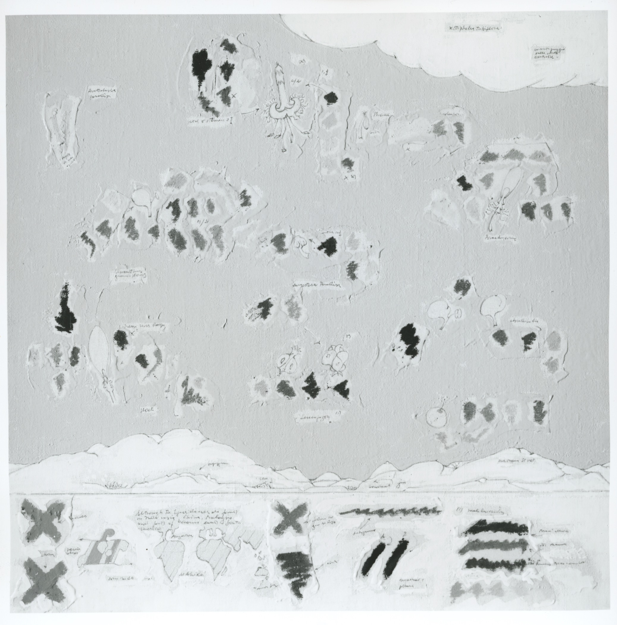 Trementina Paradise, Descrizioni di Paradiso, Monogramma Paradise, Mont Sainte Marguerite, Filastrocca Paradise, La Montagna di Bodhidharma presentano, come nel caso di Tendenza a esistere, una composizione bipartita. Nella parte alta, campeggiano profili di montagne e di cieli riconducibili al tema del giardino e del bosco, affrontati da Baruchello secondo diverse prospettive e modalità, proprio dalla metà degli anni Ottanta[22]. Al di sotto, entro una banda larga orizzontale, che si estende per tutta la lunghezza del dipinto, si susseguono segni cruciformi, macchie di colore, forme biomorfe e minuscole iscrizioni, alle volte poste in orizzontale seguendo il verso di lettura dell’opera, in altre lateralmente forzando lo sguardo a una visione rizomatica. Inoltre, in tutti i casi citati le opere presentano un medesimo supporto in tela e l’utilizzo di pastelli a cera per lo sfondo dei cieli, dello smalto per le piccole immagini e simboli, e della matita, invece, per i profili e per le iscrizioni.